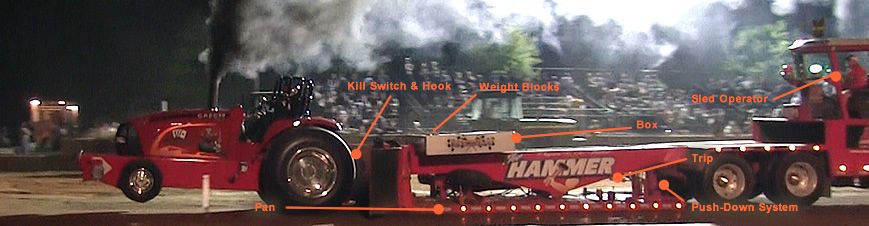 - Box- Contains the weight used to stop the vehicle and moves up the length of the sled rails progressively during the pull, driven off the front set of sled wheels.